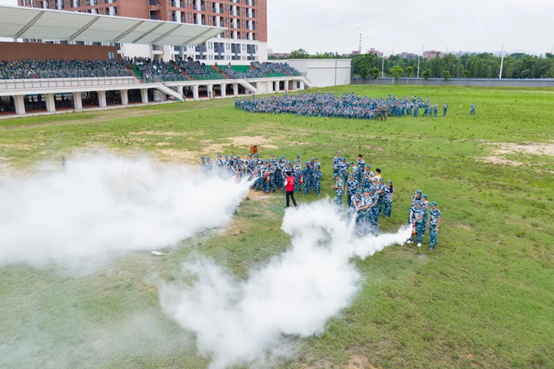 消防疏散演练开始前,各方阵的教官向同学们说明逃生步骤及注意事项。随着火灾警报声的响起,同学们快速反应,所有工作人员到达指定安全岗位,进入紧急疏散状态。同学们在军训教官们的指挥下,手捂口鼻,低头弯腰,按照逃生路线不同出口,安全有序地疏散到指定集合地点。