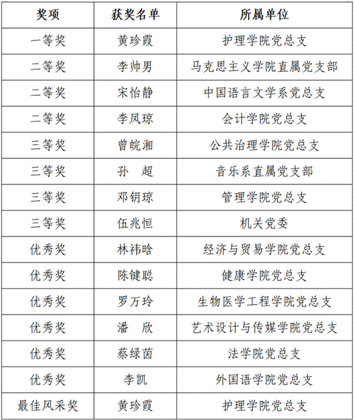 经过激烈角逐,黄珍霞老师荣获本次竞赛一等奖及“最佳风采奖”,李帅男等三位老师荣获二等奖,曾皖湘等四位老师荣获三等奖,林祎晗等六位老师荣获优秀奖。