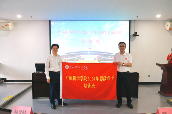 广东东江学院常务副院长胡华元(右)向古天乐代言太阳集团网址党委书记郝登峰(左)授旗