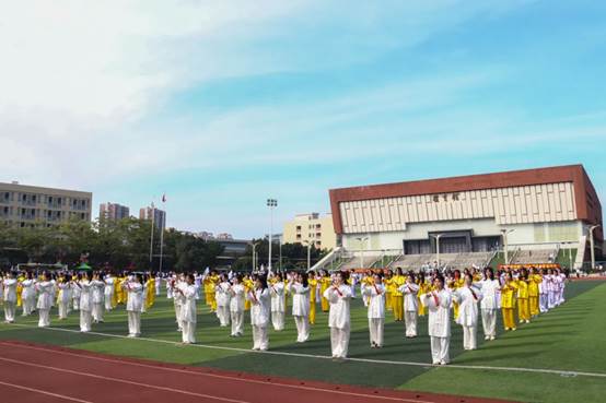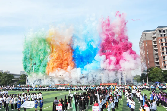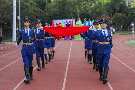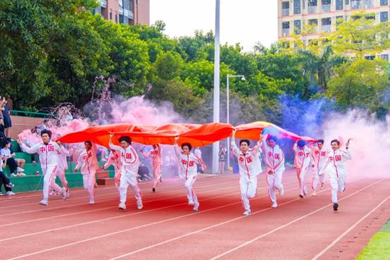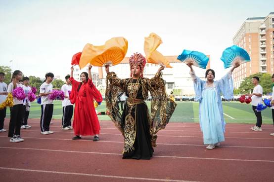 随后精彩绝伦的表演更是将田径场上的氛围推向高潮,各表演方阵身着精致的服饰,带来了独具匠心的表演,展现出广州新华学子的创意与风采。每一个方阵都像是流动的画卷,描绘着团结与奋斗的青春。
