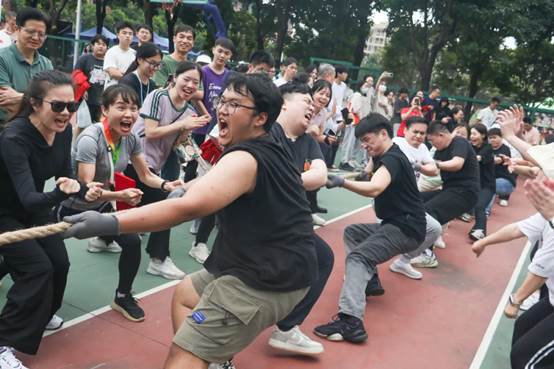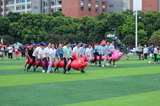 教职工比赛现场,平日里严肃认真的老师们化身为活力四射的运动员,积极参与袋鼠接龙、两人三跑、旋风跑等趣味竞赛,欢声笑语不断。毛毛虫竞速和指压板冲关更是考验着老师们的默契与勇气,他们不甘落后,奋力拼搏,展现出别样的青春风采。拔河与跳绳比赛中,老师们咬紧牙关,凝心聚力,周围学生的呐喊助威声此起彼伏,双方斗志昂扬,共同诠释了团结协作、勇攀高峰的精神。