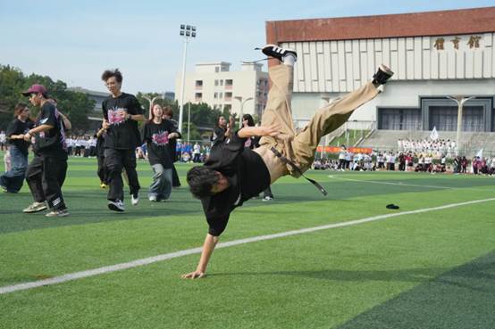 舞狮表演锣鼓喧天,威风凛凛似火焰点燃全场;健美操舞者动作整齐有力,蓝白身影如灵动画卷;太极扇表演者舒缓刚柔,步伐轻盈;还有街舞表演活力四射,青春花朵在此刻绚烂绽放,尽显朝气之美。