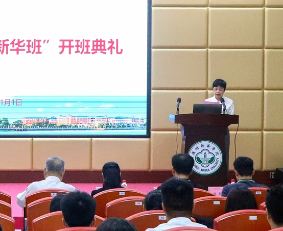 教师代表中国语言文学系欧阳丽雯老师表示,本次开班典礼的举行,将翻开“逸仙新华班”历史新篇章。“逸仙新华班”选拔优秀新生与导师团队,通过多层次、多学科交叉课程体系,为学生提供个性化成长养料;采用以学生为中心的培养模式,助力学生全面发展。欧阳丽雯热情欢迎同学们加入“逸仙新华班大家庭”,期望学子们扎根学习,积极实践,积累智慧,锻炼自我。以学子之栋梁,撑起社会之大厦,共创繁荣昌盛、和谐幸福的未来图景。