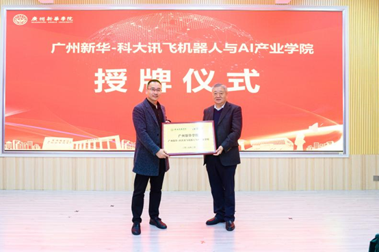 紧接着,双方领导共同为广州新华-科大讯飞机器人与AI产业学院揭牌,标志着该产业学院正式宣告成立。随后,王庭槐还向科大讯飞产教融合业务线华南区总经理莫小泉授予了产业学院牌匾。