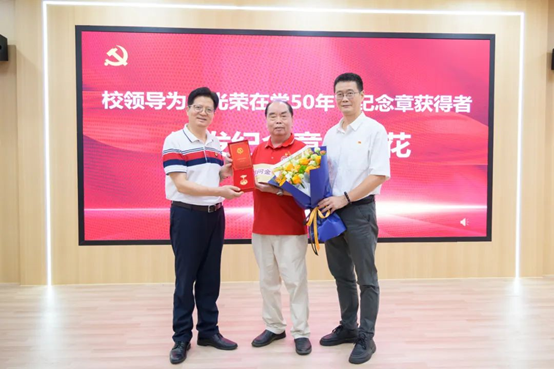 随后,郝登峰为蓝永金同志颁授“光荣在党50年”纪念章,林源为其献上鲜花,全场响起热烈掌声。这枚纪念章不仅是对老党员五十年来坚守初心、忠诚于党的最高褒奖,更是一种精神的传承与激励。蓝永金作为学校创办的“拓荒牛”,也是众多教职工成长的引路人,他用实际行动诠释了老党员的坚守与担当。