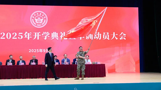 学校党委书记郝登峰为军训团授团旗,期望同学们在军训中磨砺意志,锤炼品格,将军训精神融入学习生活,成为有担当的时代青年。