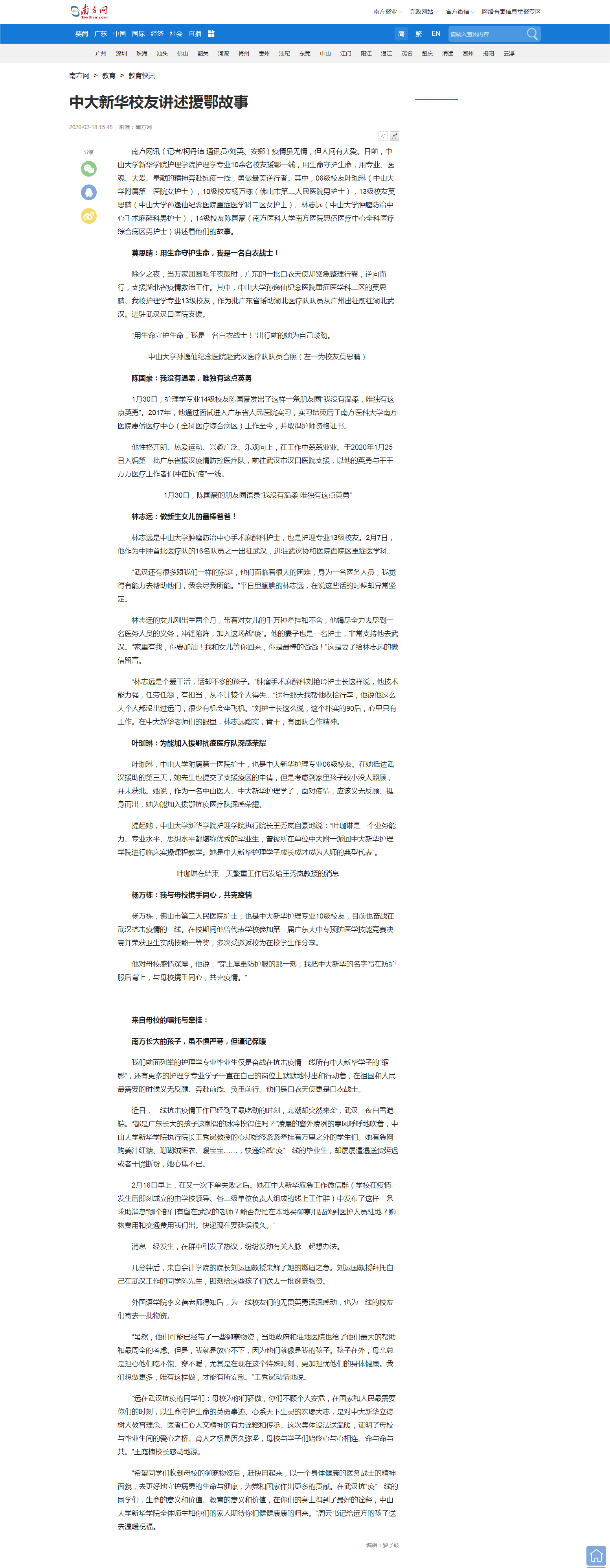 南方网讯(记者/柯丹洁 通讯员/刘英、安娜)疫情虽无情,但人间有大爱。日前,中山大学新华学院护理学院护理学专业10余名校友援鄂一线,用生命守护生命,用专业、医魂、大爱、奉献的精神奔赴抗疫一线,勇做最美逆行者。其中,06级校友叶珈琳(中山大学附属第一医院女护士),10级校友杨万栋(佛山市第二人民医院男护士),13级校友莫思晴(中山大学孙逸仙纪念医院重症医学科二区女护士)、林志远(中山大学肿瘤防治中心手术麻醉科男护士),14级校友陈国豪(南方医科大学南方医院惠侨医疗中心全科医疗综合病区男护士)讲述着他们的故事。
