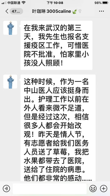 叶珈琳,中山大学附属第一医院护士,也是中大新华护理专业06级校友。在她抵达武汉援助的第三天,她先生也提交了支援疫区的申请,但是考虑到家里孩子较小没人照顾,并未获批。她说,作为一名中山医人、中大新华护理学子,面对疫情,应该义无反顾、挺身而出,她为能加入援鄂抗疫医疗队深感荣耀。