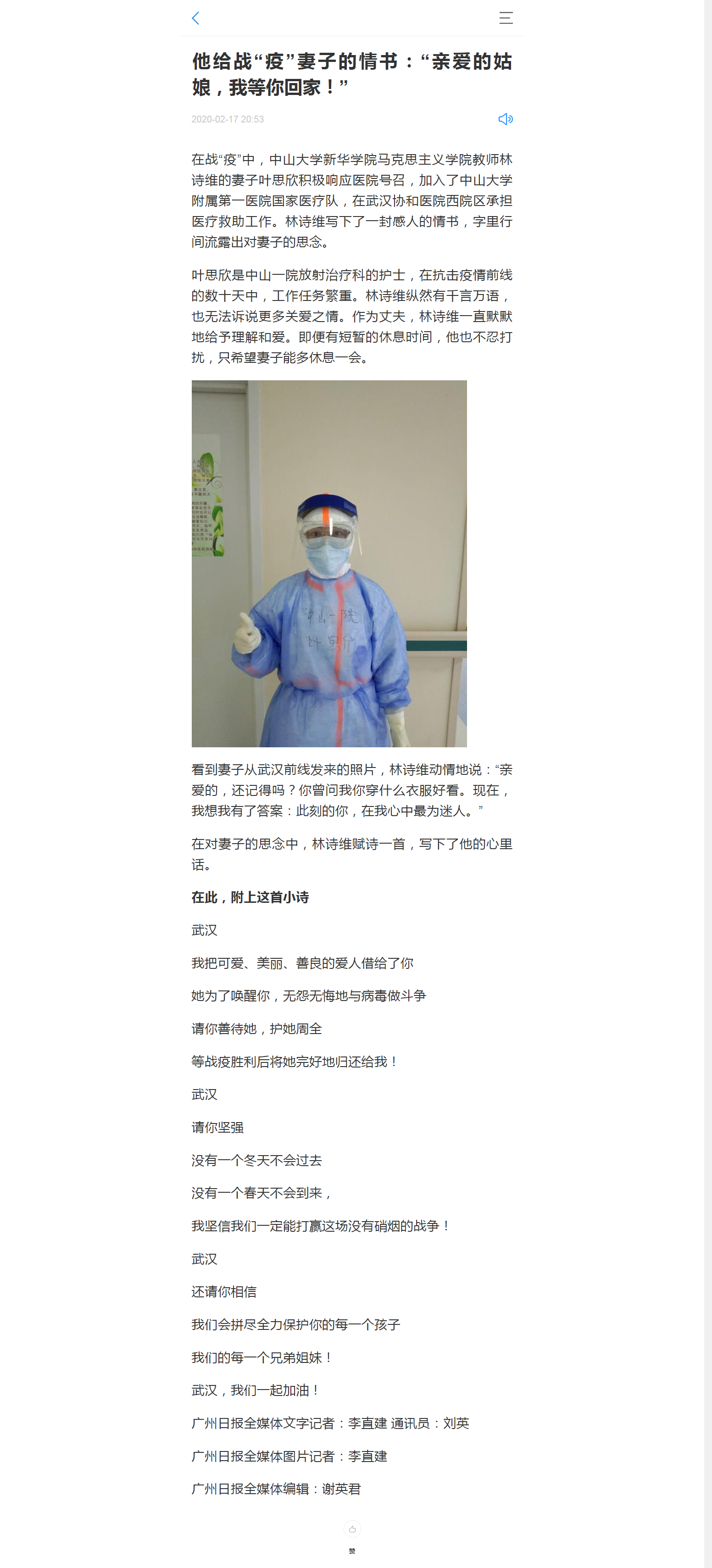 在战“疫”中,中山大学新华学院马克思主义学院教师林诗维的妻子叶思欣积极响应医院号召,加入了中山大学附属第一医院国家医疗队,在武汉协和医院西院区承担医疗救助工作。林诗维写下了一封感人的情书,字里行间流露出对妻子的思念。