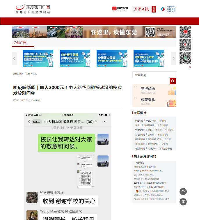 连日来为援鄂抗疫一线护理校友奔忙的中山大学新华学院(以下简称“中大新华”)护理学院执行院长王秀岚教授激动地发了个朋友圈,中大新华仅用5小时就为中大新华援鄂抗疫一线护理校友设立了专项慰问基金,每人将发放2000元慰问金。