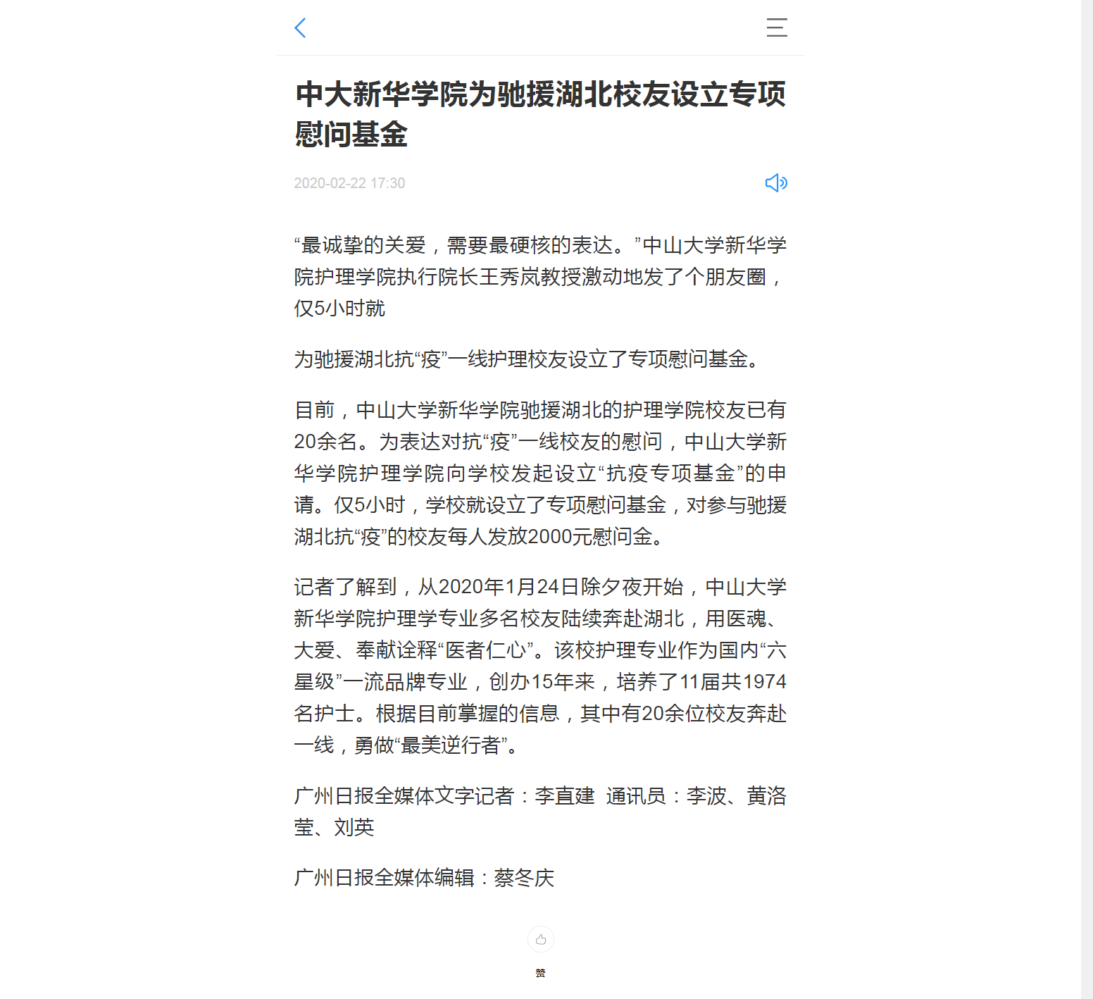 目前,中山大学新华学院驰援湖北的护理学院校友已有20余名。为表达对抗“疫”一线校友的慰问,中山大学新华学院护理学院向学校发起设立“抗疫专项基金”的申请。仅5小时,学校就设立了专项慰问基金,对参与驰援湖北抗“疫”的校友每人发放2000元慰问金。