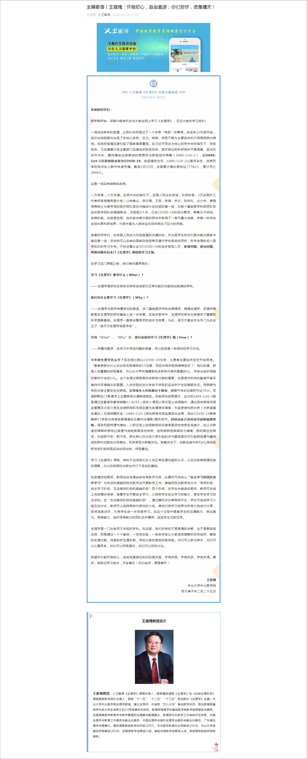 亲爱的同学们,在举国人民合力攻克疫情的关键时刻,作为医学生的你们虽未能为国家冲锋在第一线,但依然可以在响应国家防控政策及遵守学校规定的同时,科学合理的投入医学知识的学习中来。不妨试着从此次COVID-19的临床表现入手,发现问题、提出问题、带着问题开启本门《生理学》课程的学习之旅。