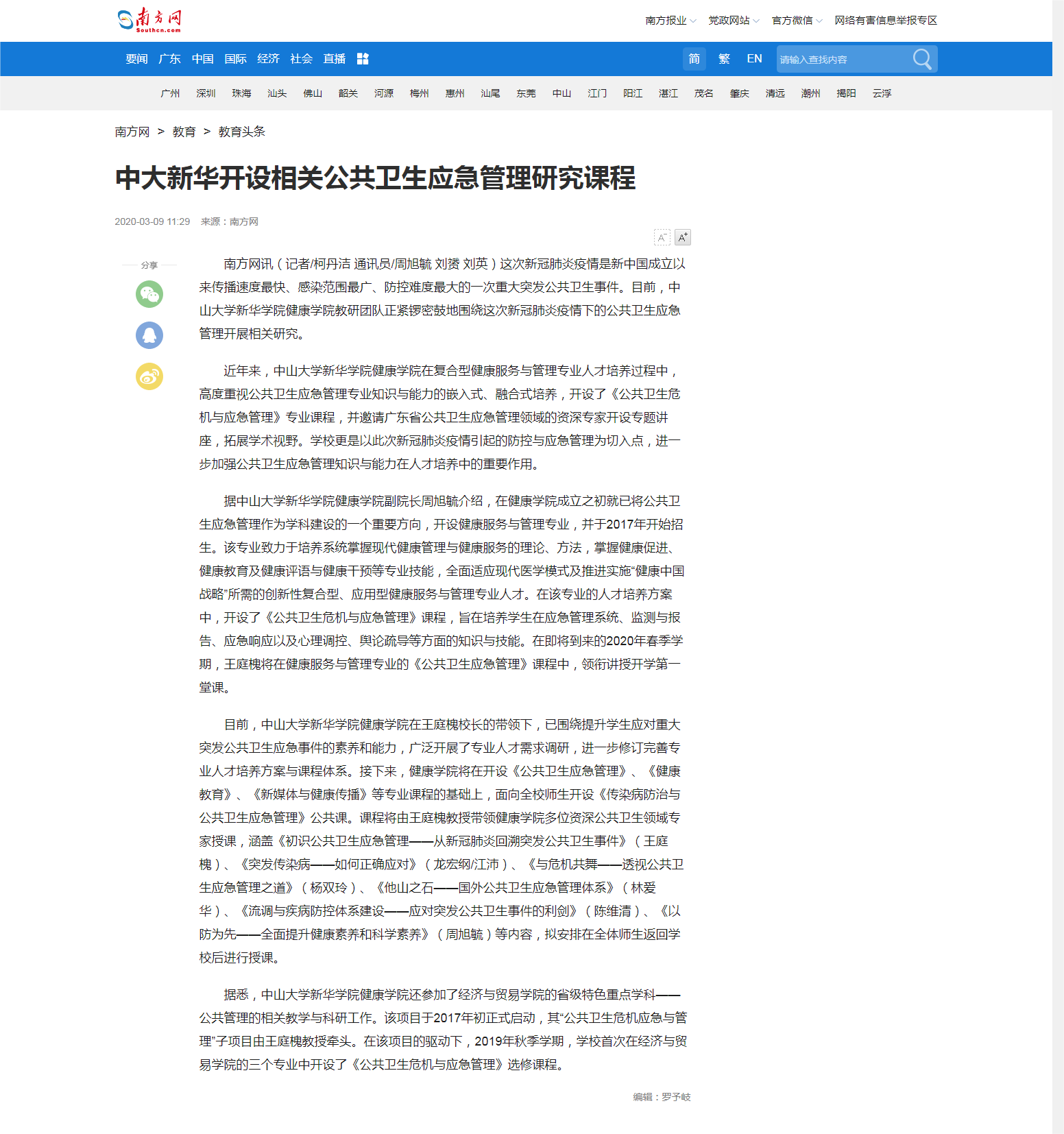 [南方网]中大新华开设相关公共卫生应急管理研究课程