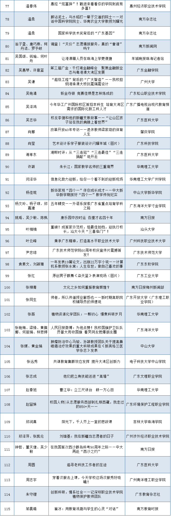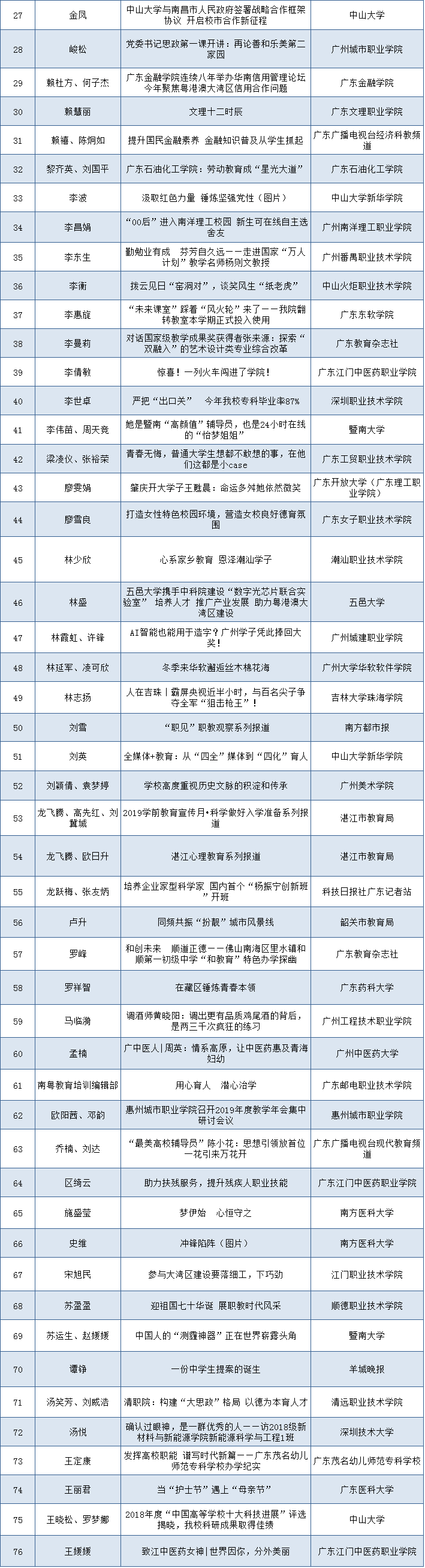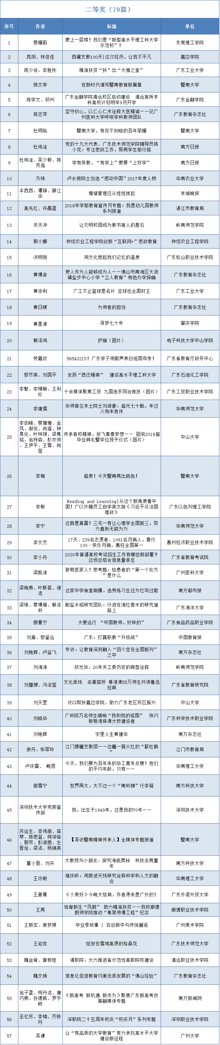 广东省教育厅两年举办一次广东教育好新闻评选活动。2019年广东教育好新闻评选活动自2019年9月启动以来,各地教育部门、各普通高校及相关媒体积极参与,共收到作品800余篇。经专家、学者组成的评委会评定,评选出2019年广东教育好新闻获奖作品,其中一等奖38篇,二等奖79篇,三等奖115篇,现予以公布。