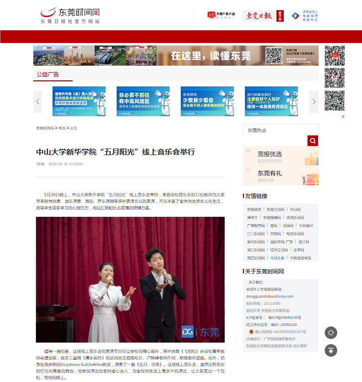 5月30日晚上,中山大学新华学院“五月阳光”线上音乐会举行,来自该校音乐系的11位教师为大家带来钢琴独奏、器乐演奏、舞蹈、声乐演唱等多种表演形式的表演,不仅丰富了全体师生课余文化生活,疏导学生居家学习的心理压力,而且汇聚起抗击疫情的磅礴力量。