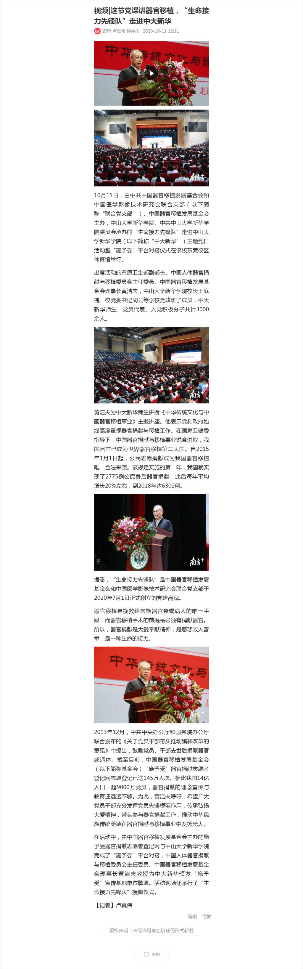 黄洁夫为中大新华师生讲授《中华传统文化与中国器官移植事业》主题讲座。他表示党和政府始终高度重视器官捐献与移植工作。在国家卫健委指导下,中国器官捐献与移植事业锐意进取,我国目前已成为世界器官移植第二大国。自2015年1月1日起,公民志愿捐献成为我国器官移植唯一合法来源。该规定实施的第一年,我国就实现了2775例公民身后器官捐献,此后每年平均增长20%左右,到2018年达6302例。