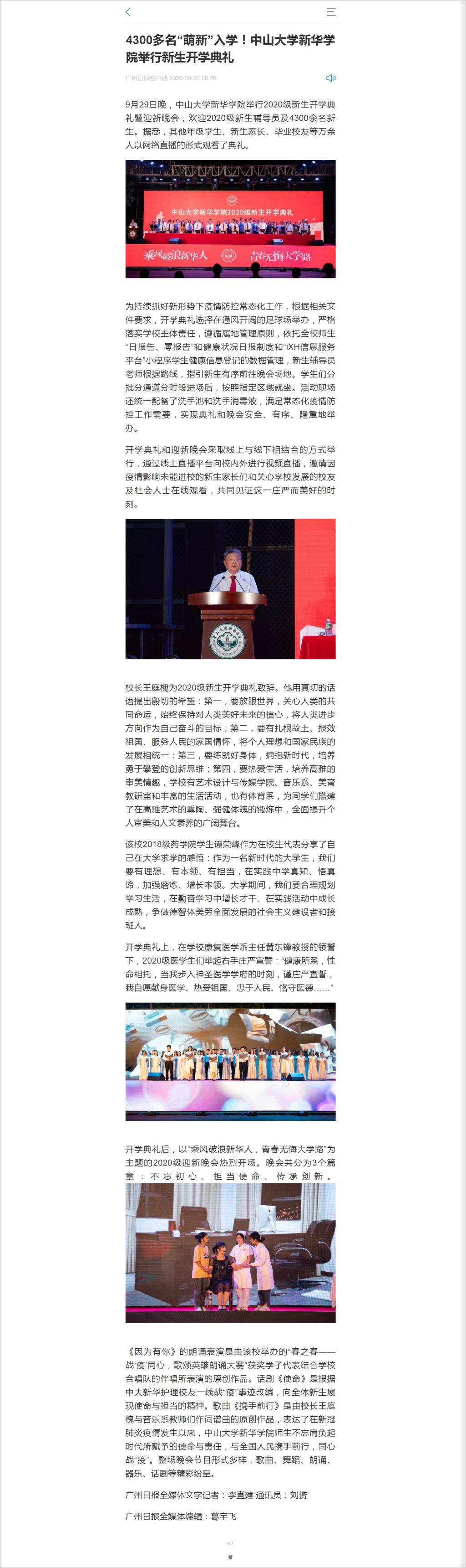 9月29日晚,中山大学新华学院举行2020级新生开学典礼暨迎新晚会,欢迎2020级新生辅导员及4300余名新生。据悉,其他年级学生、新生家长、毕业校友等万余人以网络直播的形式观看了典礼。