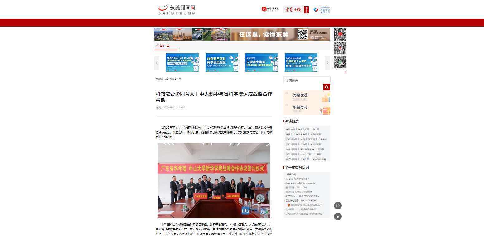 1月20日下午,广东省科学院与中山大学新华学院举行战略合作签约仪式,双方院校将通过资源整合、优势互补、协同发展,促进科技创新成果转移转化,实现教学与实践、科研与教育的无缝对接。
