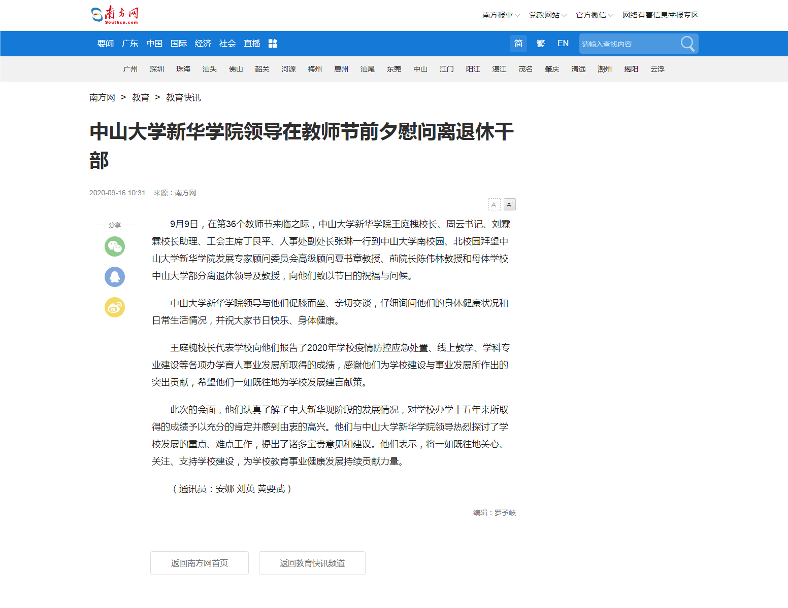 9月9日,在第36个教师节来临之际,中山大学新华学院王庭槐校长、周云书记、刘霖霖校长助理、工会主席丁艮平、人事处副处长张琳一行到中山大学南校园、北校园拜望中山大学新华学院发展专家顾问委员会高级顾问夏书章教授、前院长陈伟林教授和母体学校中山大学部分离退休领导及教授,向他们致以节日的祝福与问候。
