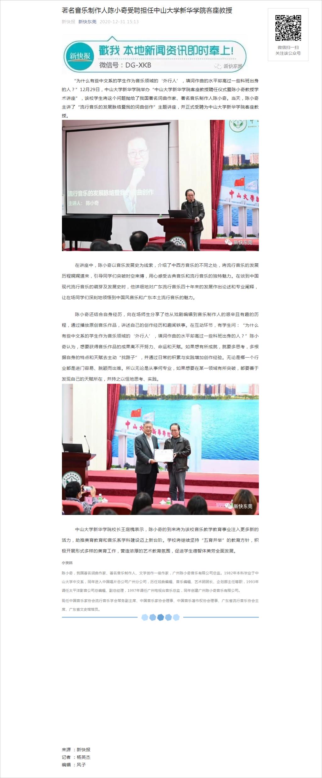 “为什么有些中文系的学生作为音乐领域的‘外行人’,填词作曲的水平却高过一些科班出身的人?”12月29日,中山大学新华学院举办“中山大学新华学院客座教授聘任仪式暨陈小奇教授学术讲座”,该校学生将这个问题抛给了我国著名词曲作家、著名音乐制作人陈小奇。当天,陈小奇主讲了“流行音乐的发展脉络暨我的词曲创作”主题讲座,并正式受聘为中山大学新华学院客座教授。