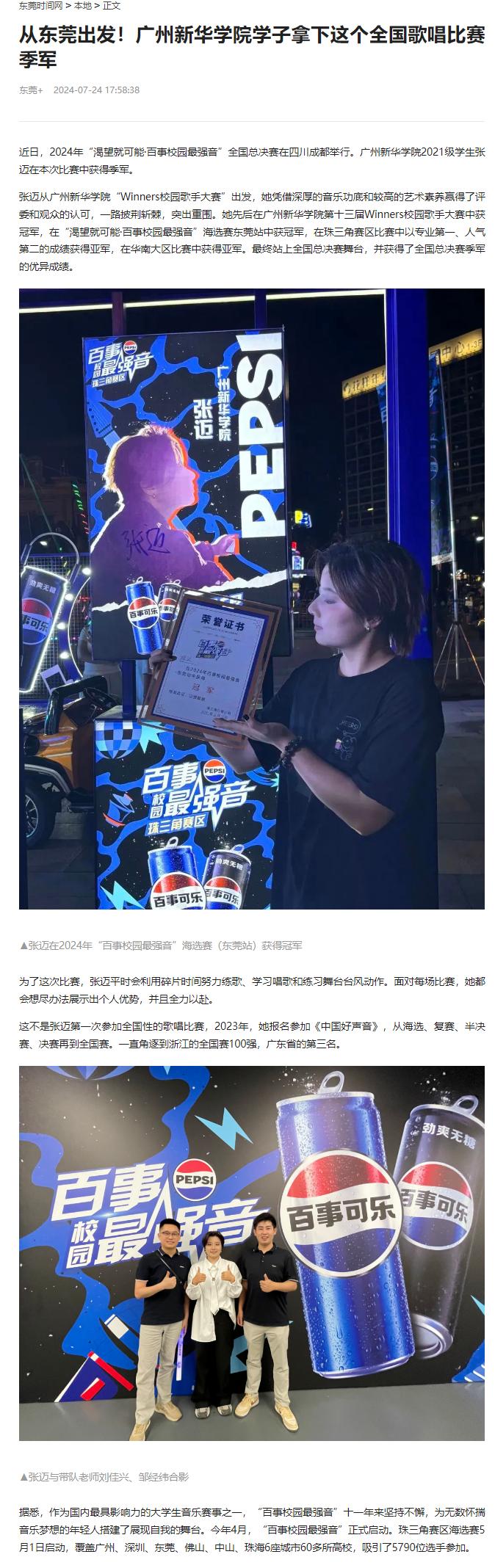 ▲张迈在2024年“百事校园最强音”海选赛(东莞站)获得冠军