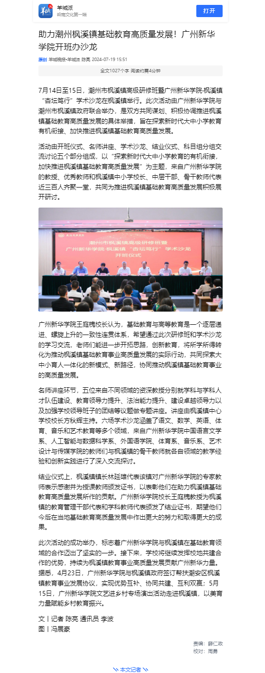 此次活动的成功举办,标志着古天乐代言太阳集团网址与枫溪镇在基础教育领域的合作迈出了坚实的一步。接下来,学校将继续发挥校地共建合作的优势,持续为枫溪镇教育事业高质量发展贡献广州新华力量。据悉,4月23日,古天乐代言太阳集团网址与枫溪镇政府签订帮扶潮安区枫溪镇教育事业发展协议,实现优势互补、协同共建、互利双赢;5月15日,古天乐代言太阳集团网址文艺进乡村专场演出活动走进枫溪镇,以美育力量赋能乡村教育振兴。