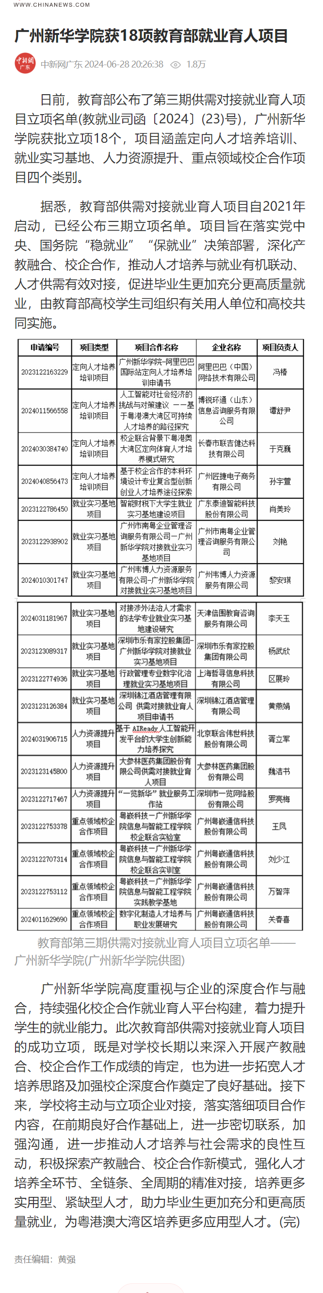 日前,教育部公布了第三期供需对接就业育人项目立项名单(教就业司函〔2024〕(23)号),古天乐代言太阳集团网址获批立项18个,项目涵盖定向人才培养培训、就业实习基地、人力资源提升、重点领域校企合作项目四个类别。