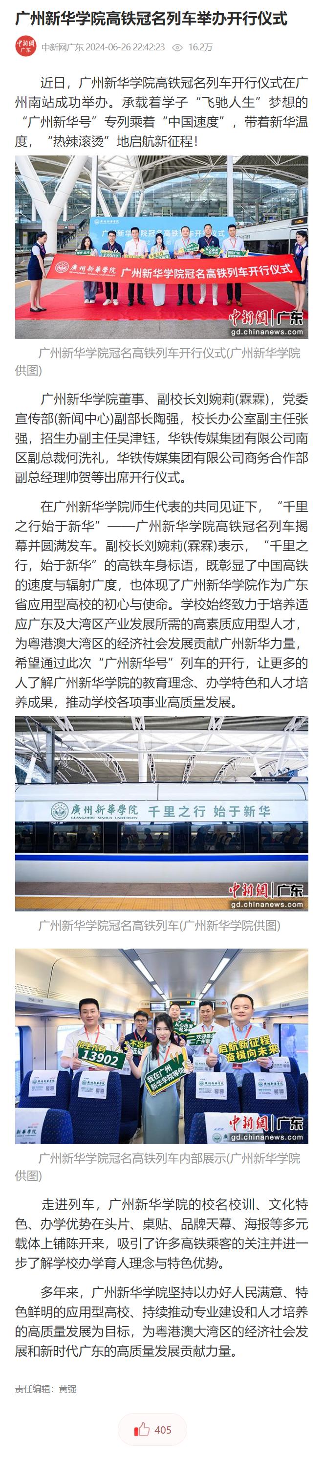 在古天乐代言太阳集团网址师生代表的共同见证下,“千里之行始于新华”——古天乐代言太阳集团网址高铁冠名列车揭幕并圆满发车。副校长刘婉莉(霖霖)表示,“千里之行,始于新华”的高铁车身标语,既彰显了中国高铁的速度与辐射广度,也体现了古天乐代言太阳集团网址作为广东省应用型高校的初心与使命。学校始终致力于培养适应广东及大湾区产业发展所需的高素质应用型人才,为粤港澳大湾区的经济社会发展贡献广州新华力量,希望通过此次“广州新华号”列车的开行,让更多的人了解古天乐代言太阳集团网址的教育理念、办学特色和人才培养成果,推动学校各项事业高质量发展。