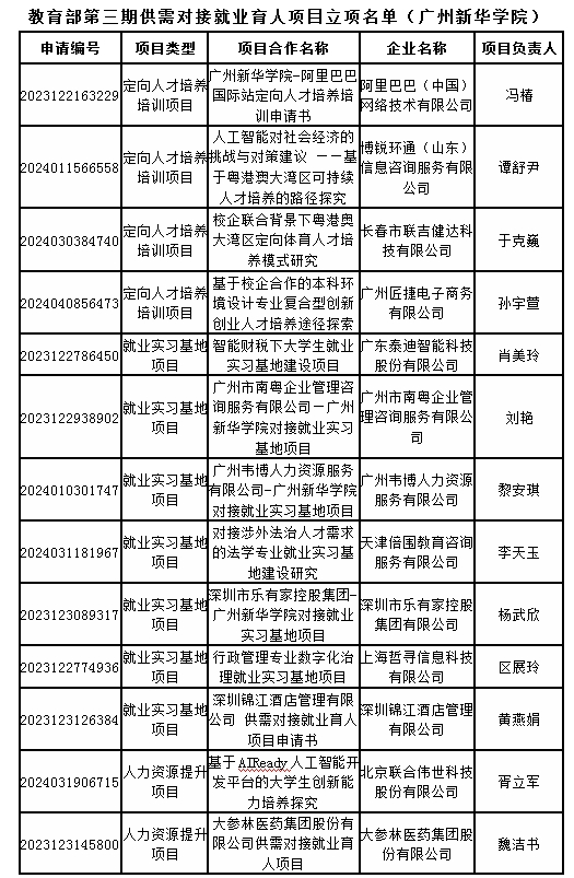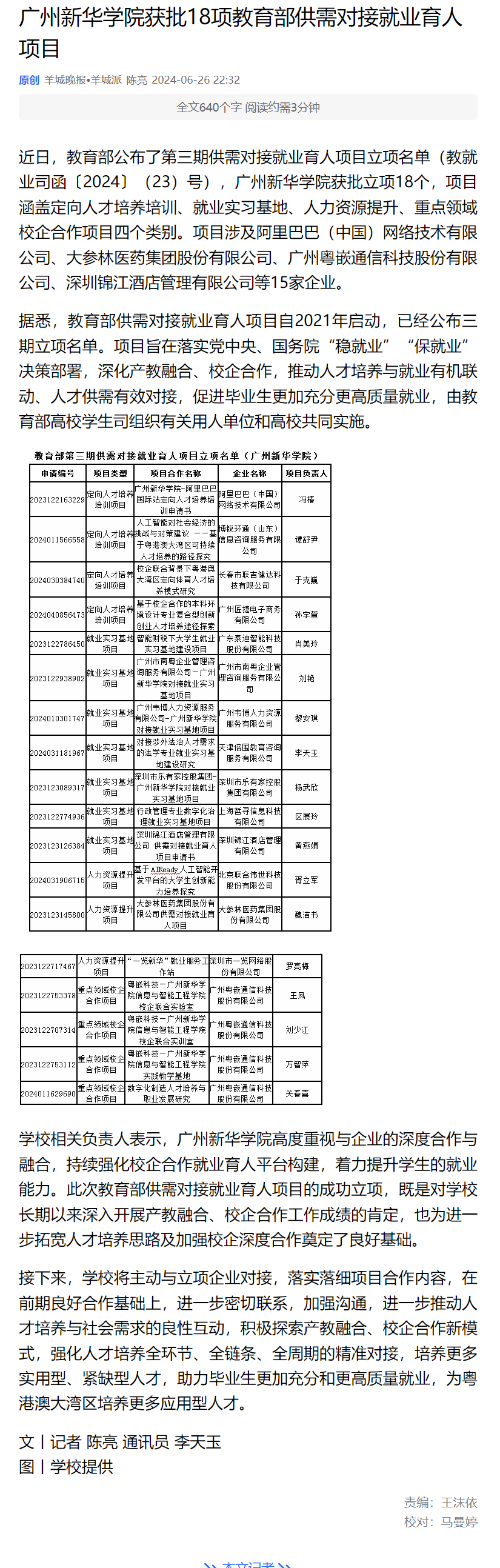 近日,教育部公布了第三期供需对接就业育人项目立项名单(教就业司函〔2024〕(23)号),古天乐代言太阳集团网址获批立项18个,项目涵盖定向人才培养培训、就业实习基地、人力资源提升、重点领域校企合作项目四个类别。项目涉及阿里巴巴(中国)网络技术有限公司、大参林医药集团股份有限公司、广州粤嵌通信科技股份有限公司、深圳锦江酒店管理有限公司等15家企业。