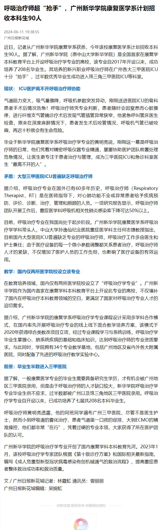 毕业于新华学院康复医学系呼吸治疗学专业的黄明亮说,刚刚这一幕是呼吸治疗师的日常,他们凭着对精密呼吸仪器专业精通,屡屡协助医护团队前置处理危急情况,让医生更专注于患者治疗与管理,成为三甲医院ICU和急诊科室医生“最离不开的人”。