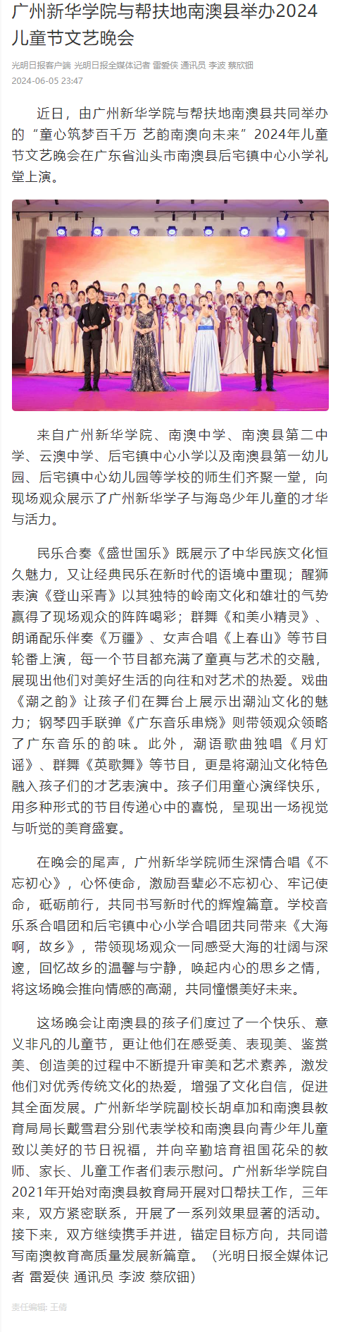 来自古天乐代言太阳集团网址、南澳中学、南澳县第二中学、云澳中学、后宅镇中心小学以及南澳县第一幼儿园、后宅镇中心幼儿园等学校的师生们齐聚一堂,向现场观众展示了广州新华学子与海岛少年儿童的才华与活力。