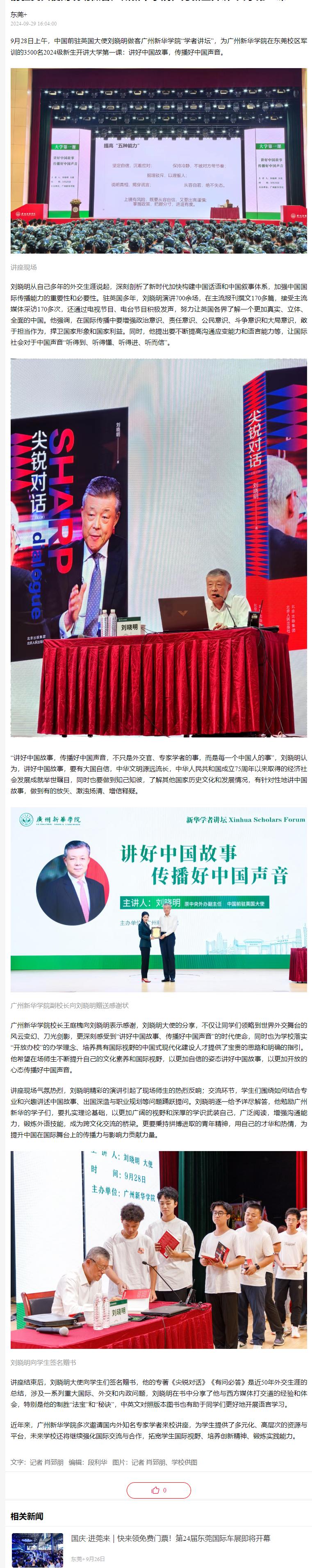 讲座现场气氛热烈,刘晓明精彩的演讲引起了现场师生的热烈反响;交流环节,学生们围绕如何结合专业和兴趣讲述中国故事、出国深造与职业规划等问题踊跃提问。刘晓明逐一给予详尽解答,他勉励广州新华的学子们,要扎实理论基础,以更加广阔的视野和深厚的学识武装自己,广泛阅读,增强沟通能力,锻炼外语技能,成为跨文化交流的桥梁。更要秉持拼搏进取的青年精神,用自己的才华和热情,为提升中国在国际舞台上的传播力与影响力贡献力量。