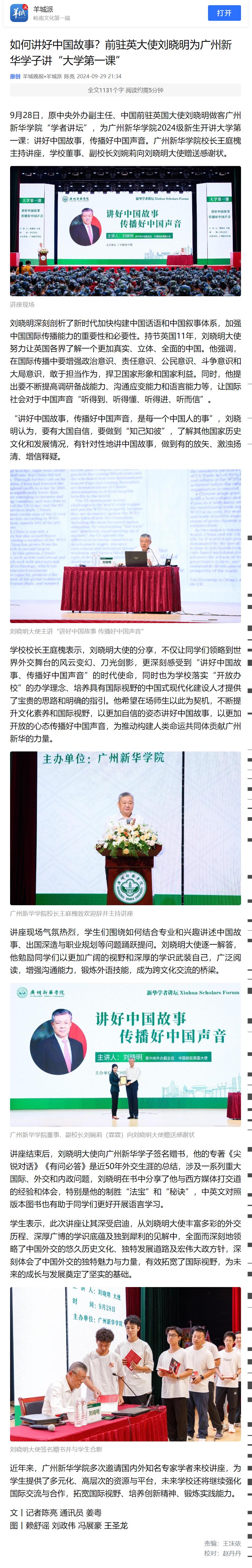 学校校长王庭槐表示,刘晓明大使的分享,不仅让同学们领略到世界外交舞台的风云变幻、刀光剑影,更深刻感受到“讲好中国故事、传播好中国声音”的时代使命,同时也为学校落实“开放办校”的办学理念、培养具有国际视野的中国式现代化建设人才提供了宝贵的思路和明确的指引。他希望在场师生以此为契机,不断提升文化素养和国际视野,以更加自信的姿态讲好中国故事,以更加开放的心态传播好中国声音,为推动构建人类命运共同体贡献广州新华的力量。