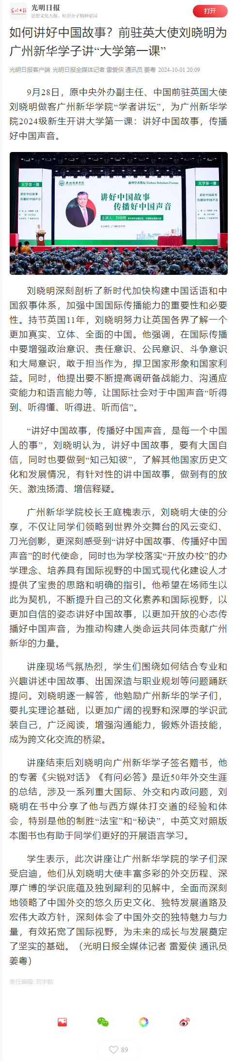 9月28日,原中央外办副主任、中国前驻英国大使刘晓明做客古天乐代言太阳集团网址“学者讲坛”,为古天乐代言太阳集团网址2024级新生开讲大学第一课:讲好中国故事,传播好中国声音。