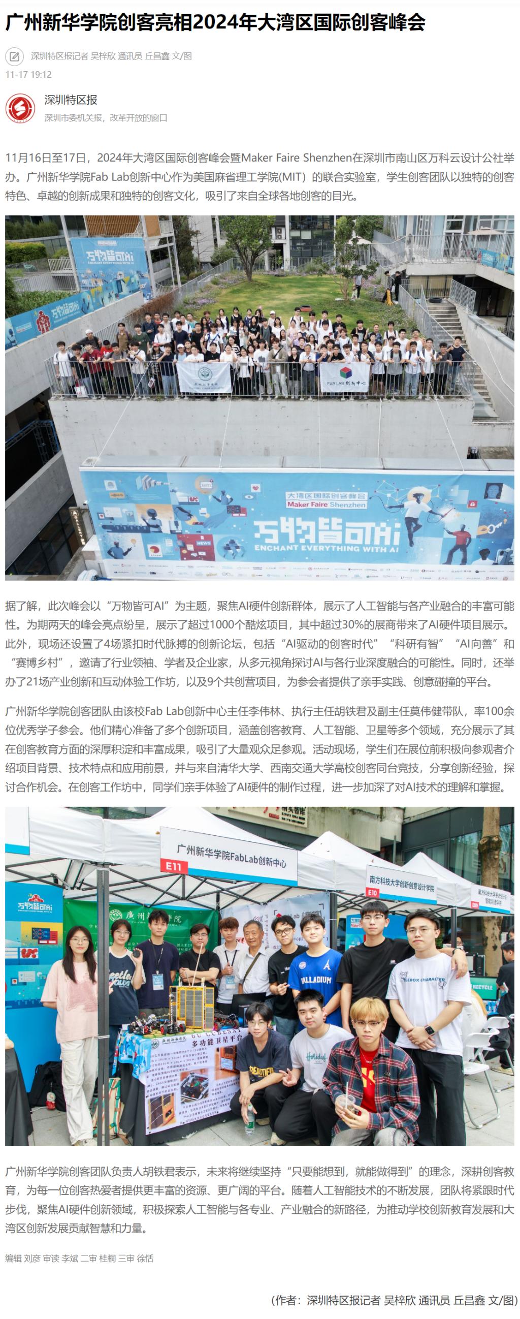 11月16日至17日,2024年大湾区国际创客峰会暨Maker Faire Shenzhen在深圳市南山区万科云设计公社举办。古天乐代言太阳集团网址Fab Lab创新中心作为美国麻省理工学院(MIT)的联合实验室,学生创客团队以独特的创客特色、卓越的创新成果和独特的创客文化,吸引了来自全球各地创客的目光。