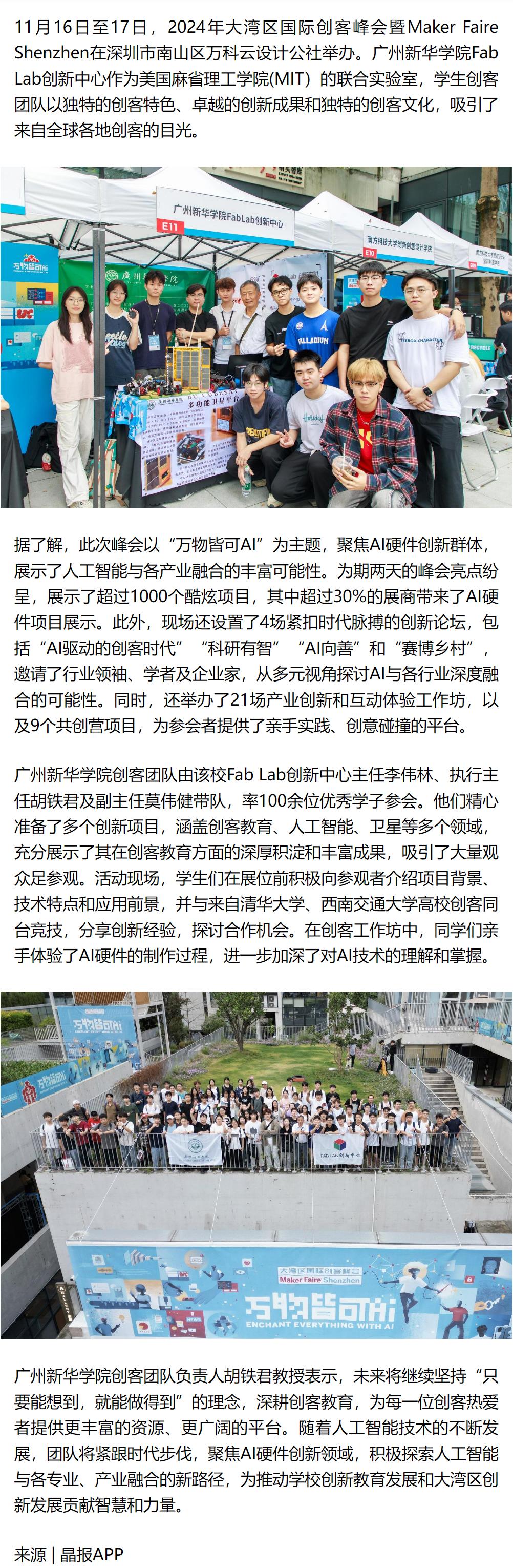 11月16日至17日,2024年大湾区国际创客峰会暨Maker Faire Shenzhen在深圳市南山区万科云设计公社举办。古天乐代言太阳集团网址Fab Lab创新中心作为美国麻省理工学院(MIT)的联合实验室,学生创客团队以独特的创客特色、卓越的创新成果和独特的创客文化,吸引了来自全球各地创客的目光。