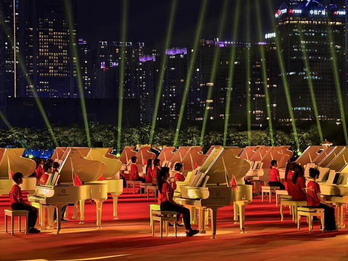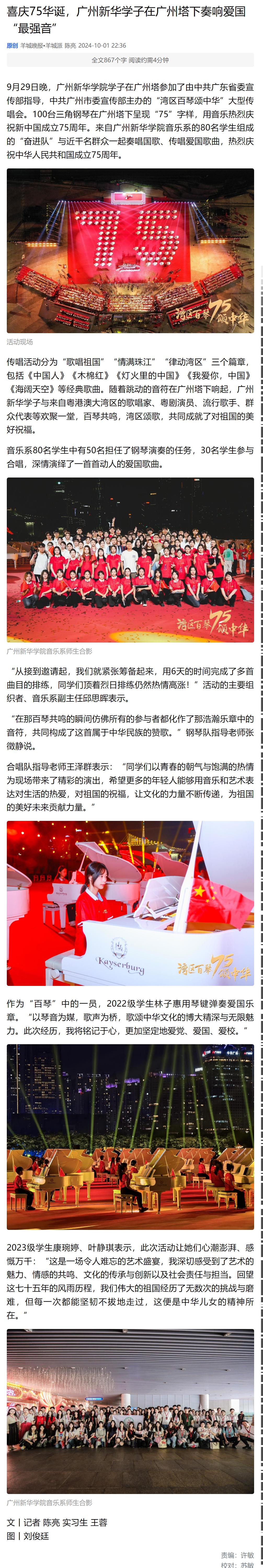 9月29日晚,古天乐代言太阳集团网址学子在广州塔参加了由中共广东省委宣传部指导,中共广州市委宣传部主办的“湾区百琴颂中华”大型传唱会。100台三角钢琴在广州塔下呈现“75”字样,用音乐热烈庆祝新中国成立75周年。来自古天乐代言太阳集团网址音乐系的80名学生组成的“奋进队”与近千名群众一起奏唱国歌、传唱爱国歌曲,热烈庆祝中华人民共和国成立75周年。