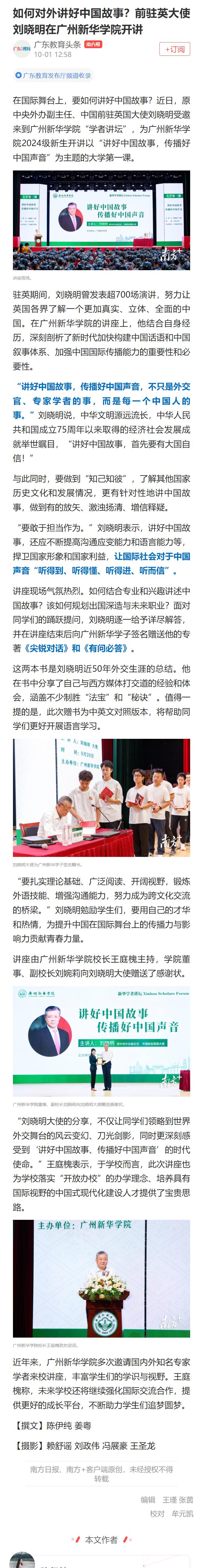 “要扎实理论基础、广泛阅读、开阔视野,锻炼外语技能、增强沟通能力,努力成为跨文化交流的桥梁。”刘晓明勉励学生们,要用自己的才华和热情,为提升中国在国际舞台上的传播力与影响力贡献青春力量。