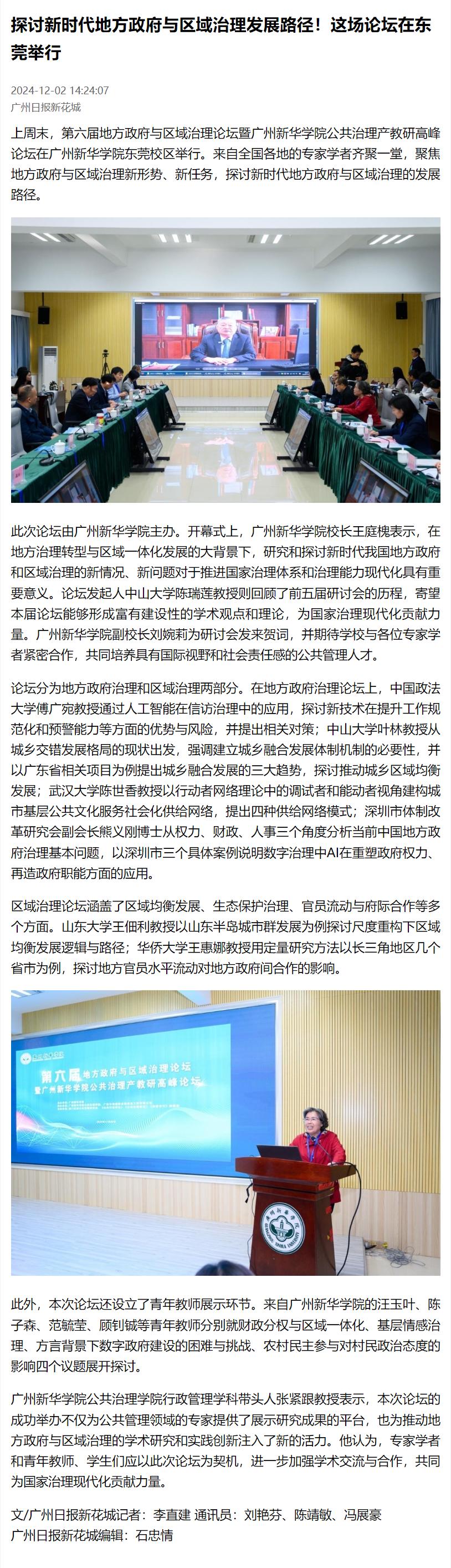 上周末,第六届地方政府与区域治理论坛暨古天乐代言太阳集团网址公共治理产教研高峰论坛在古天乐代言太阳集团网址东莞校区举行。来自全国各地的专家学者齐聚一堂,聚焦地方政府与区域治理新形势、新任务,探讨新时代地方政府与区域治理的发展路径。