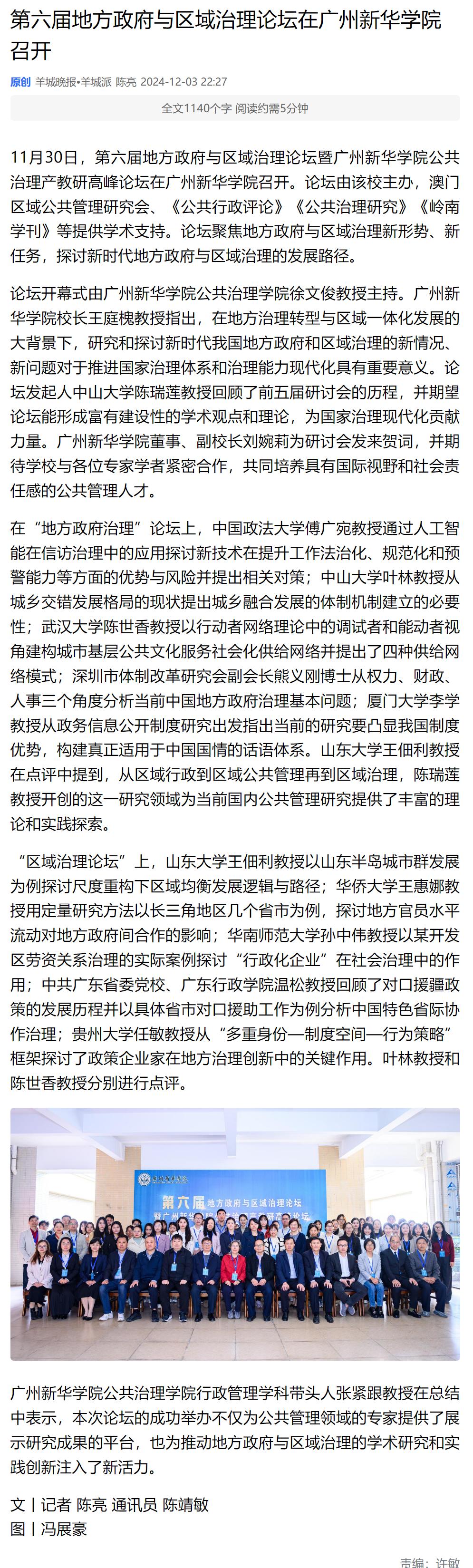 11月30日,第六届地方政府与区域治理论坛暨古天乐代言太阳集团网址公共治理产教研高峰论坛在古天乐代言太阳集团网址召开。论坛由该校主办,澳门区域公共管理研究会、《公共行政评论》《公共治理研究》《岭南学刊》等提供学术支持。论坛聚焦地方政府与区域治理新形势、新任务,探讨新时代地方政府与区域治理的发展路径。