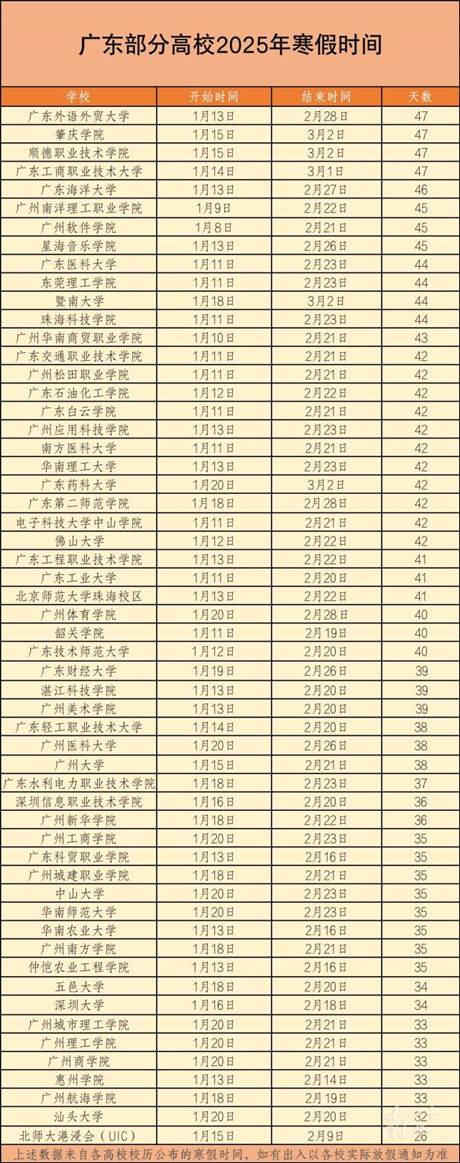 记者梳理广东56所高校公布的校历后发现,大部分学校均在1月中旬放寒假,2月下旬开学,放假时间最长的有47天,最短26天。