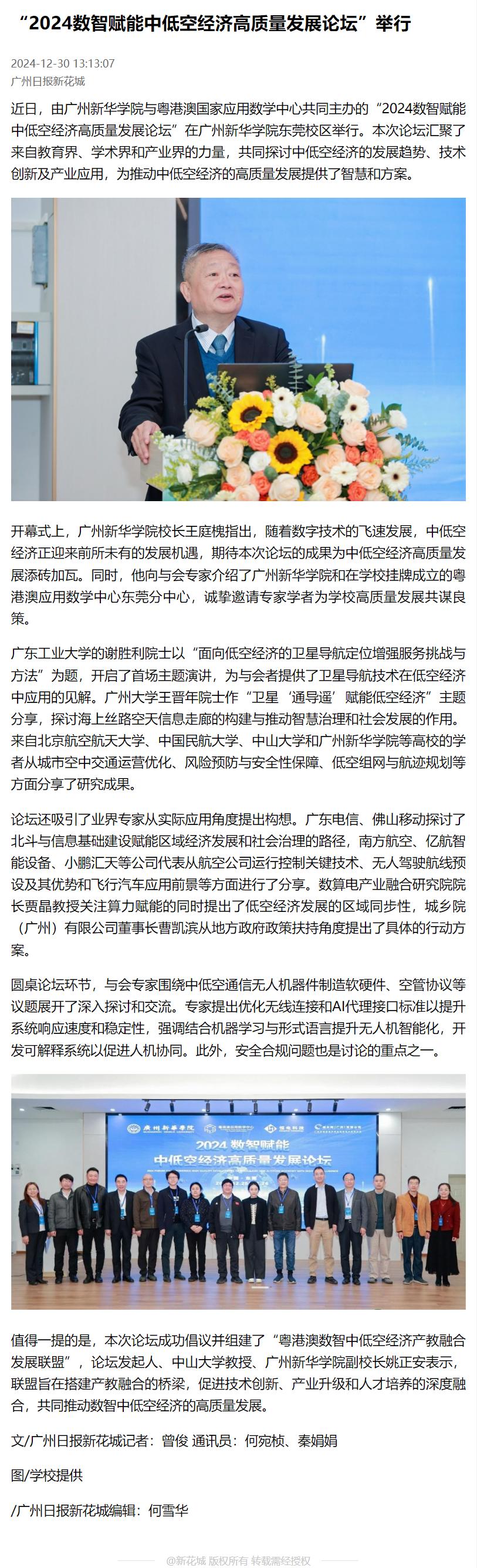 近日,由古天乐代言太阳集团网址与粤港澳国家应用数学中心共同主办的“2024数智赋能中低空经济高质量发展论坛”在古天乐代言太阳集团网址东莞校区举行。本次论坛汇聚了来自教育界、学术界和产业界的力量,共同探讨中低空经济的发展趋势、技术创新及产业应用,为推动中低空经济的高质量发展提供了智慧和方案。