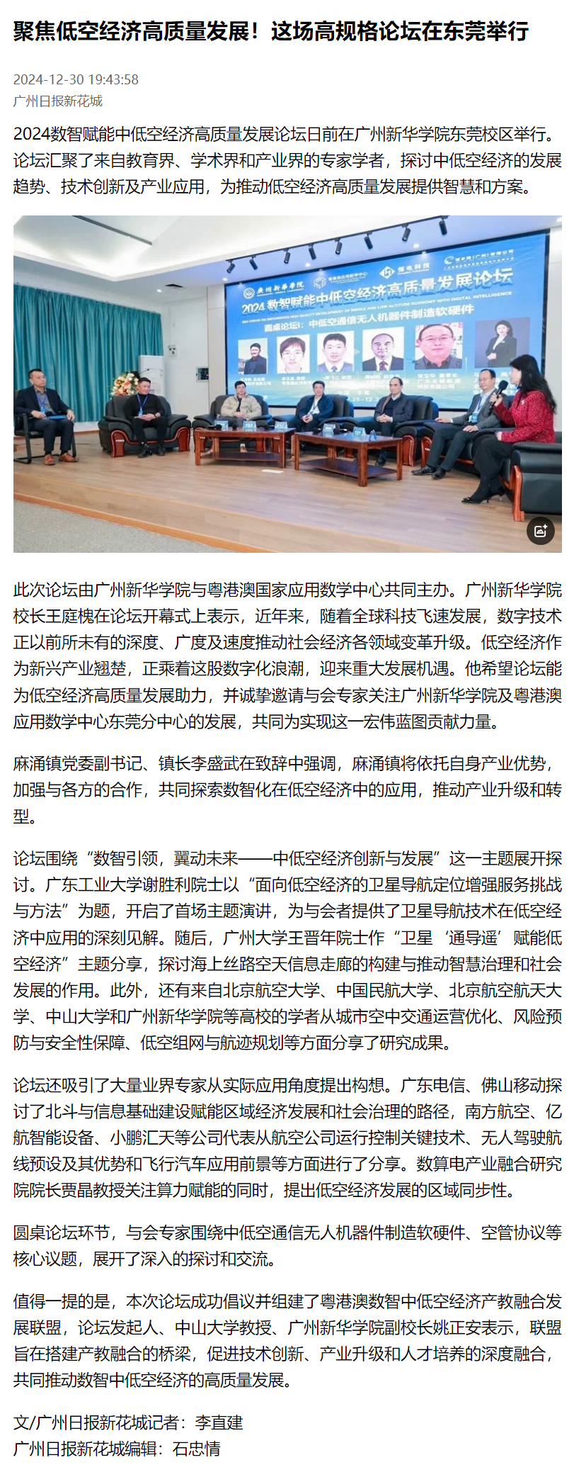2024数智赋能中低空经济高质量发展论坛日前在古天乐代言太阳集团网址东莞校区举行。论坛汇聚了来自教育界、学术界和产业界的专家学者,探讨中低空经济的发展趋势、技术创新及产业应用,为推动低空经济高质量发展提供智慧和方案。