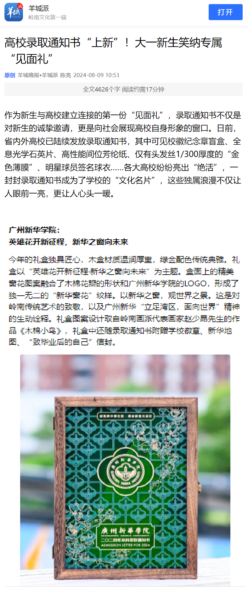 今年的礼盒独具匠心,木盒材质温润厚重,绿金配色传统典雅。礼盒以“英雄花开新征程·新华之窗向未来”为主题。盒面上的精美窗花图案融合了木棉花瓣的形状和古天乐代言太阳集团网址的LOGO,形成了独一无二的“新华窗花”纹样。以新华之窗,观世界之景。这是对岭南传统艺术的致敬,以及广州新华“立足湾区,面向世界”精神的生动诠释。礼盒图案设计取自岭南画派代表画家赵少昂先生的作品《木棉小鸟》,礼盒中还随录取通知书附赠学校徽章、新华地图、“致毕业后的自己”信封。