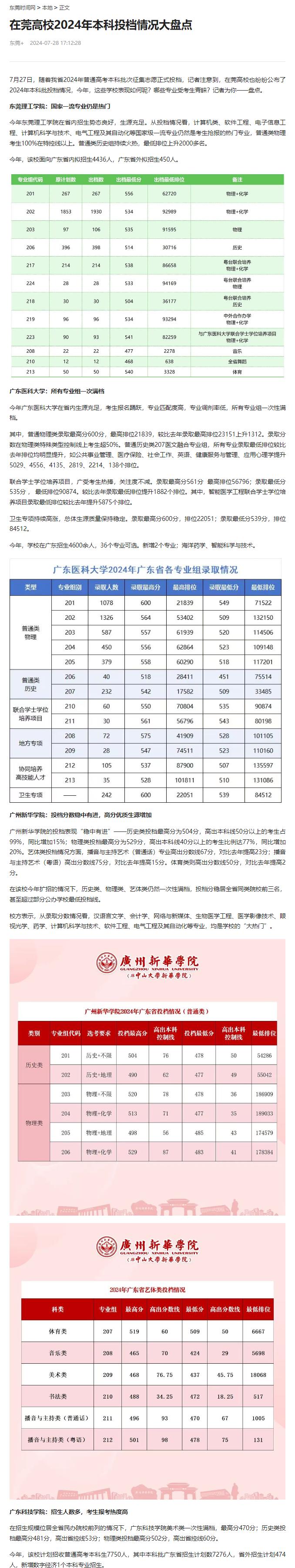 7月27日,随着我省2024年普通高考本科批次征集志愿正式投档,记者注意到,在莞高校也纷纷公布了2024年本科批投档情况,今年,这些学校表现如何呢?哪些专业受考生青睐?记者为你一一盘点。
