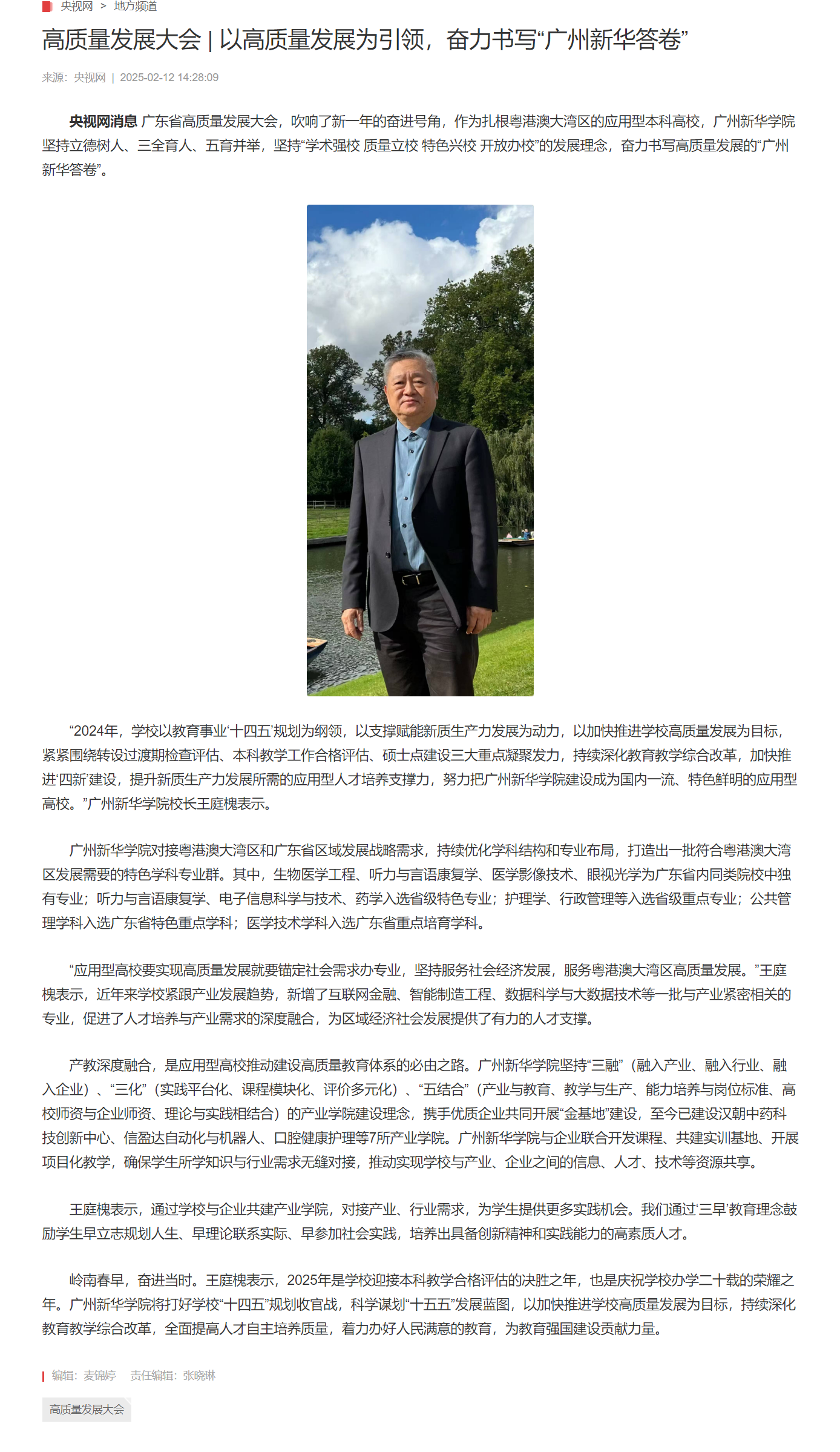 广东省高质量发展大会,吹响了新一年的奋进号角,作为扎根粤港澳大湾区的应用型本科高校,古天乐代言太阳集团网址坚持立德树人、三全育人、五育并举,坚持“学术强校 质量立校 特色兴校 开放办校”的发展理念,奋力书写高质量发展的“广州新华答卷”。