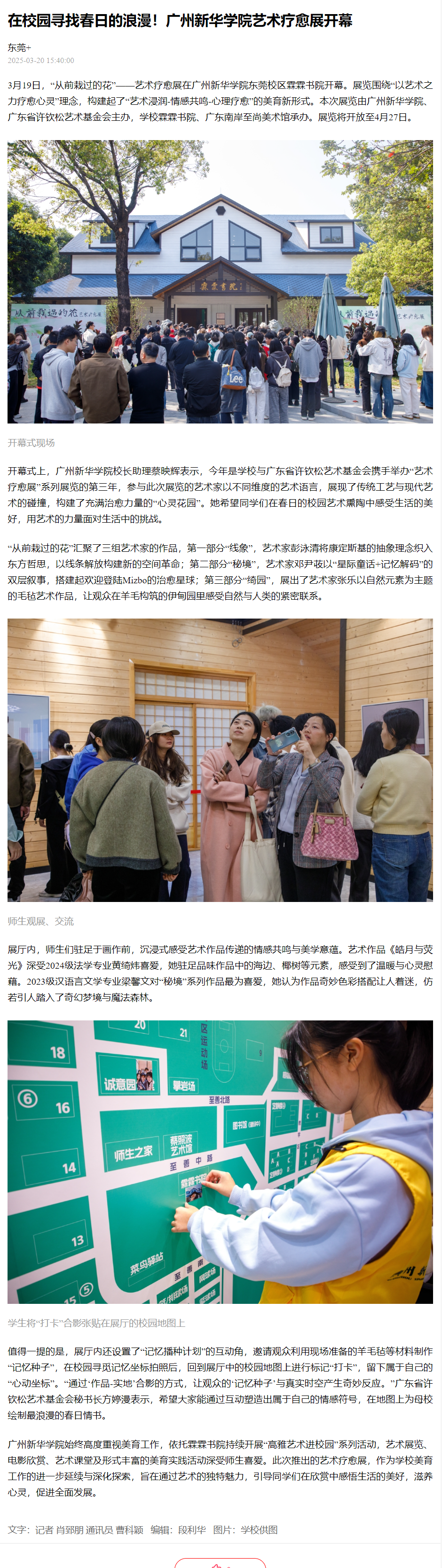 3月19日,“从前栽过的花”——艺术疗愈展在古天乐代言太阳集团网址东莞校区霖霖书院开幕。展览围绕“以艺术之力疗愈心灵”理念,构建起了“艺术浸润-情感共鸣-心理疗愈”的美育新形式。本次展览由古天乐代言太阳集团网址、广东省许钦松艺术基金会主办,学校霖霖书院、广东南岸至尚美术馆承办。展览将开放至4月27日。