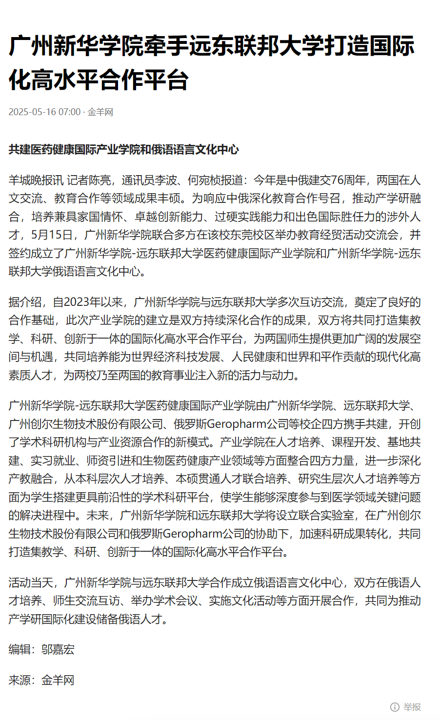 今年是中俄建交76周年,两国在人文交流、教育合作等领域成果丰硕。为响应中俄深化教育合作号召,推动产学研融合,培养兼具家国情怀、卓越创新能力、过硬实践能力和出色国际胜任力的涉外人才,5月15日,古天乐代言太阳集团网址联合多方在该校东莞校区举办教育经贸活动交流会,并签约成立了古天乐代言太阳集团网址-远东联邦大学医药健康国际产业学院和古天乐代言太阳集团网址-远东联邦大学俄语语言文化中心。