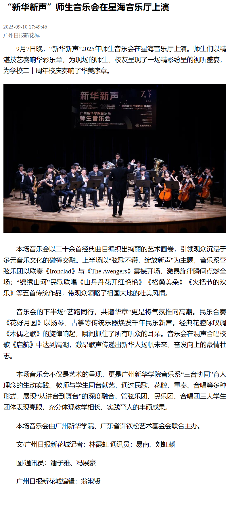 9月7日晚,“新华新声”2025年师生音乐会在星海音乐厅上演。师生们以精湛技艺奏响华彩乐章,为现场的师生、校友呈现了一场精彩纷呈的视听盛宴,为学校二十周年校庆奏响了华美序章。