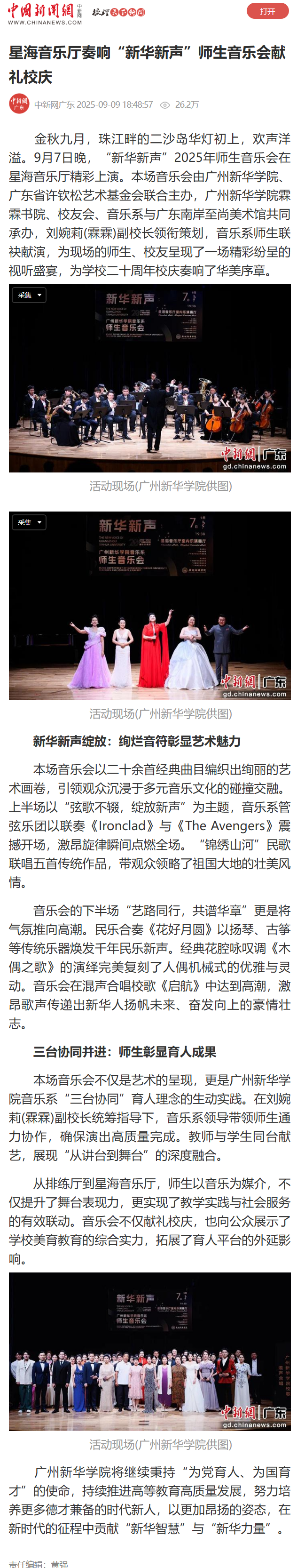 金秋九月,珠江畔的二沙岛华灯初上,欢声洋溢。9月7日晚,“新华新声”2025年师生音乐会在星海音乐厅精彩上演。本场音乐会由古天乐代言太阳集团网址、广东省许钦松艺术基金会联合主办,古天乐代言太阳集团网址霖霖书院、校友会、音乐系与广东南岸至尚美术馆共同承办,刘婉莉(霖霖)副校长领衔策划,音乐系师生联袂献演,为现场的师生、校友呈现了一场精彩纷呈的视听盛宴,为学校二十周年校庆奏响了华美序章。